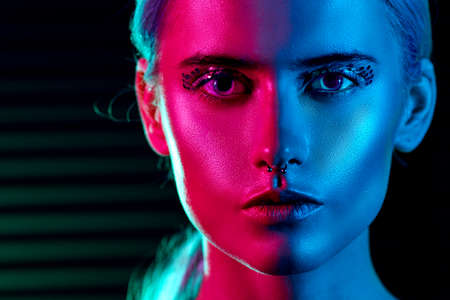 Fashionable Artistic Portrait Of A Beautiful Female Model In Bright Lights. Color gel photography