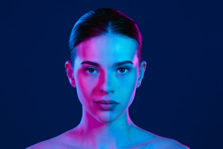 Close-up portrait of young bautiful girl attentively looking at camera, posing isolated over blue background in neon light
