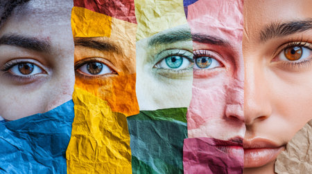 A striking graphic collage features multiple human eyes and upper faces arranged in horizontal stripes, set against a vibrant multicolor background, creating a diverse representation