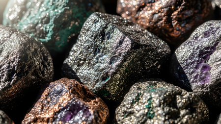 A pile of raw mineral rocks glitters with metallic sheens of silver, gold, and iridescent colors. The macro shot captures the rough, granular texture and the sparkle of the ore, suitable for geology and mining themes.