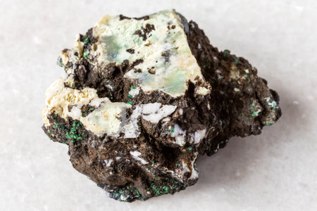 sample of raw tenorite mineral with chrysocolla on white marble background close up from Southern Urals, Russia