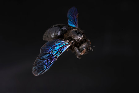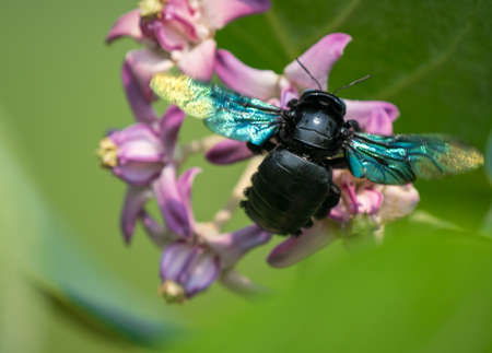 Xylocopa valga or carpenter bee on Calotropis procera or Apple of Sodom flowers. Macro with shallow DOF