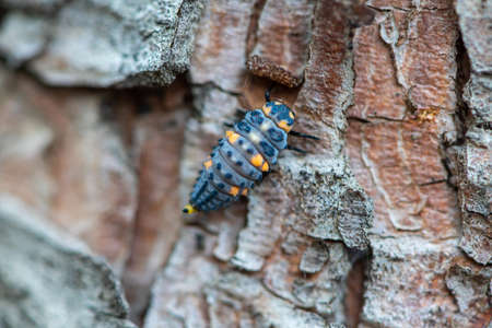 Close-up of a ladybird larvae on a tree. Shallow depth of field.