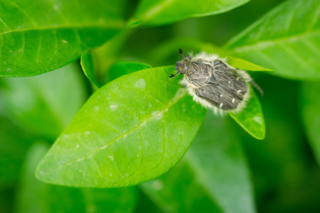 Close up of Tropinota hirta beetle crawling on green leafs .