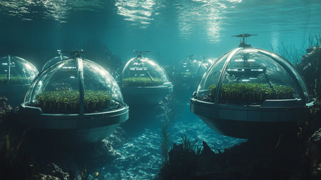 Futuristic submersibles navigate through colorful reefs, illuminating the aquatic world below.