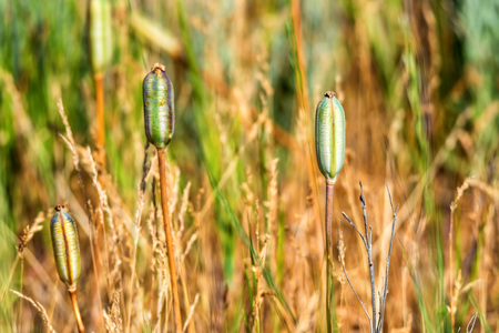 Poppy seed pods in flower meadow with shallow depth of field