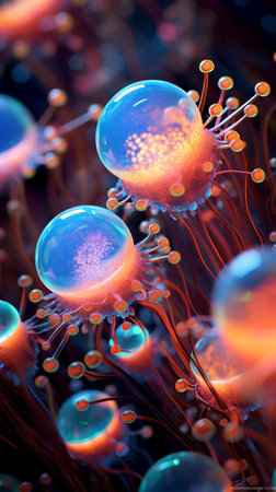 Intricate world of living cells in this closeup, showcasing glowing organic structures on a stunning blue background, revealing lives microscopic beauty