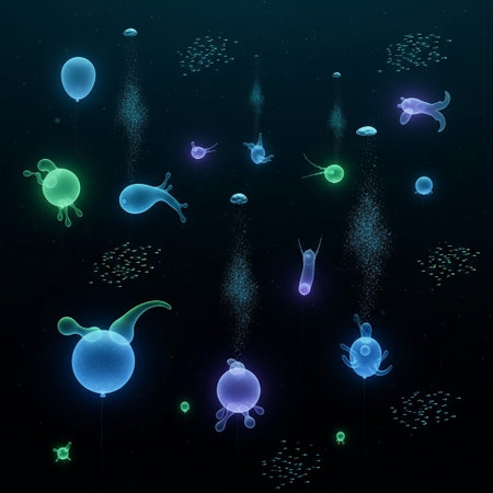 Close-up of plankton glowing in vivid colors under a high-powered microscope, revealing their unique structures