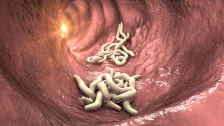 Parasitic worms in the lumen of intestine, 3D illustration. Ascaris lumbricoides, Enterobius vermicularis, and other round worms