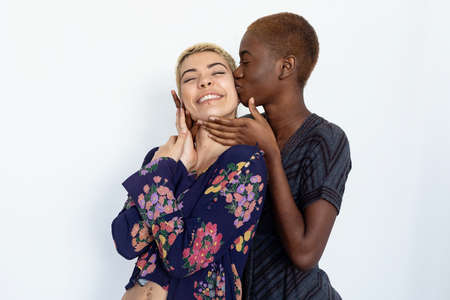 Photo of joyful girls kissing and embracing togetherness, being of different of races, dressed in casual clothes.