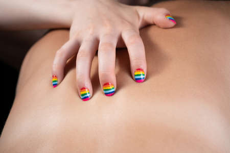Tender multiethnic lesbian couple lying on a lgbt rainbow flag