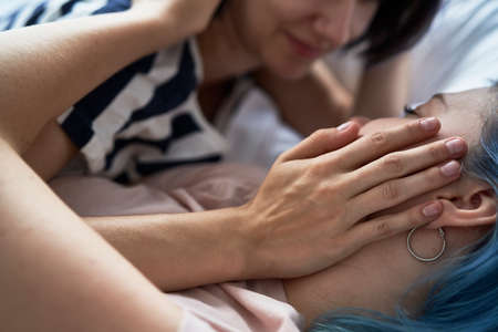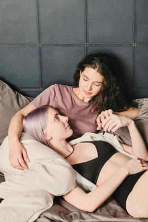 Attractive young lesbians lying on bed and touching hands of each other while looking into eyes