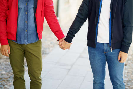 Young men holding hands with lgbt flag background closeup. Gay love concept