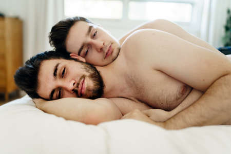 Overhead view young gay couple lying down on bed, spending time together. LGBT, pride, relationships and equality concept.