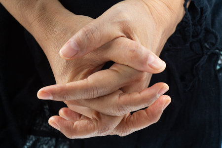 Woman's hands praying on Black scarf background, Close up & Macro shot, Selective focus, Asian body skin part, Symbol, Gesturing, Body Language concept