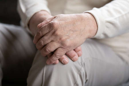 Close up elderly lonely man folded wrinkled hands on lap, mature old grandfather sitting alone, thinking about past, lost in thoughts, aging process concept, loneliness and solitude