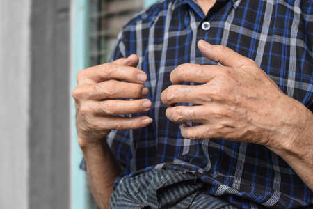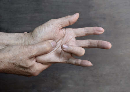 Flexor tendon pain in Asian old man. Concept of flexor tendonitis. Tendons injury.