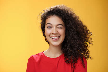 Portrait of funny and cool sister with curly hair winking playfully having fun and foolind around showing tongue as playing with siblings adoring spend time with chidren over yellow background