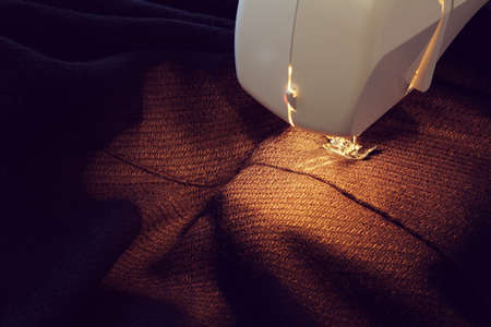 household sewing machine sews woolen coat details at home close up