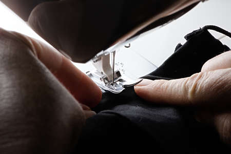 High contrast close up image of a black face covering or mask being fed into a sewing machine by older aged hands.