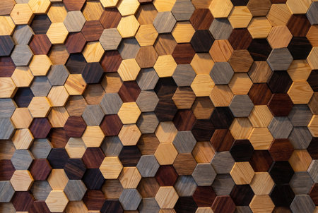 A detailed close up of a modern decorative wall featuring a mosaic of hexagonal wooden tiles in diverse natural wood tones creating a rich textured background.