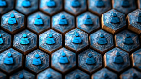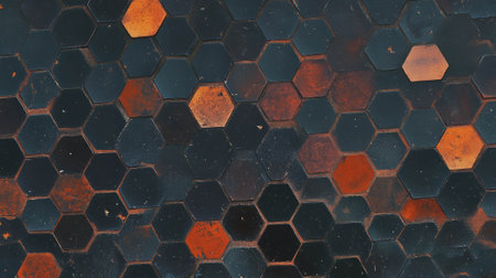 The image features a detailed view of textured hexagonal tiles arranged in a pattern, showcasing a metallic edge. The surface is intricately designed, emphasizing depth and visual interest..