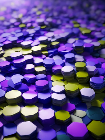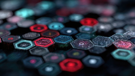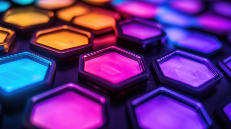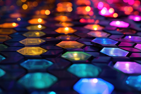 Intricate abstract composition of colorful hexagonal shapes on a dark surface, showcasing modern design and technology suitable for creative applications and projects.
