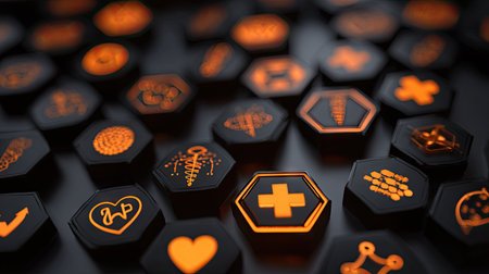 Numerous illuminated medical symbols in orange and yellow adorn dark hexagonal shapes, suggesting technology. The close-up perspective showcases intricate details and a depth of field effect. The imagery could be utilized for various commercial purposes, including healthcare, technology, and design projects. The lighting highlights the textures and overall composition.