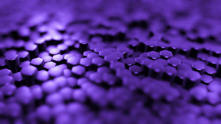 This image features an abstract hexagonal pattern illuminated by a soft purple glow against a dark background, ideal for modern design and technology themes.