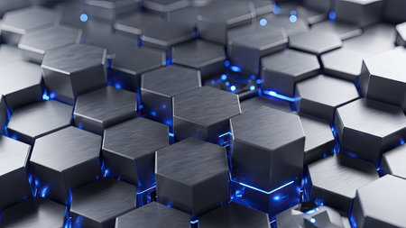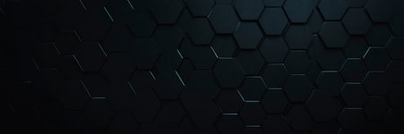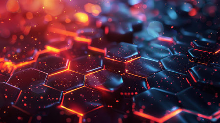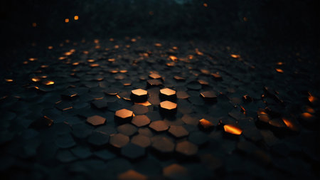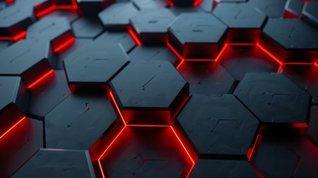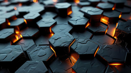 Futuristic pattern with black hexagons and glowing elements. 3D rendering with shallow DOF