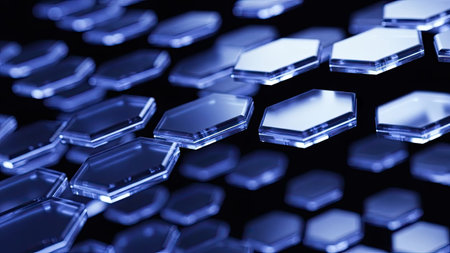 Glowing hexagonal grids in metallic and holographic tones create a mesmerizing display