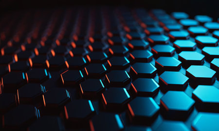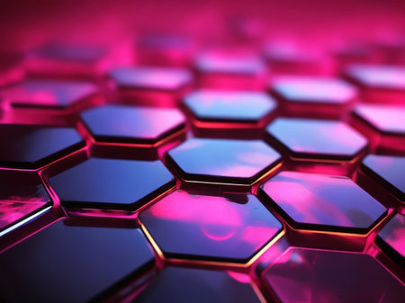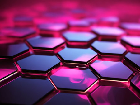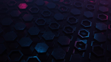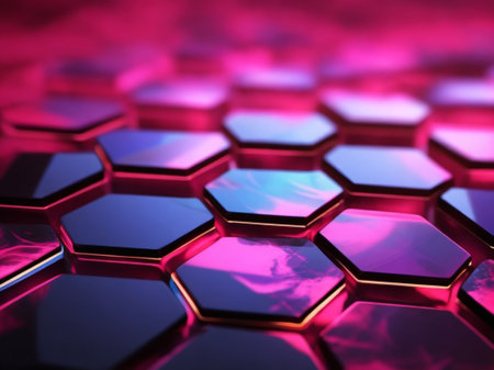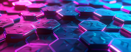 A neon background with a repeating pattern of glowing hexagons in neon blue and purple, creating a high-tech and futuristic feel.