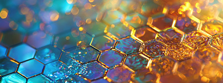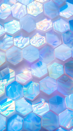 Abstract background showing iridescent hexagonal tiles forming a colorful honeycomb pattern