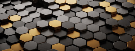 The showcases a 3D rendered background featuring a hexagonal pattern composed of alternating black and gold tiles. The tiles a glossy, reflective surface that creates a sense of depth and dimension. The gold tiles are lighter and more reflective, contrasting sharply with the darker, matte black tiles. The arrangement is precise and uniform, giving the pattern a structured yet visually dynamic appearance. The overall effect is sleek and modern, with a strong emphasis on geometric shapes and...