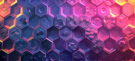 Multicolored hexagon pattern with vivid pink and orange tones. Close-up of a lively abstract design. Futuristic neon Honeycombs. Concept of modern art, geometry, and digital aesthetics. Backdrop