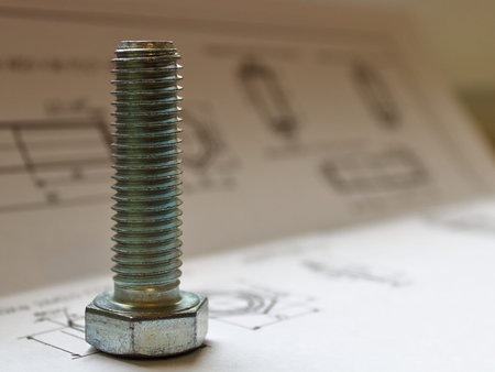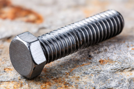 Industrial details, mechanical objects and tools concept. Screws, bolts on steel big machinery closeup