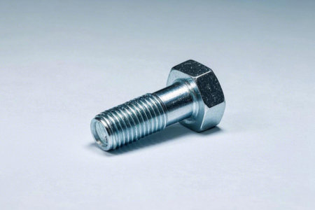 Close-up of a steel bolt against a white background, showcasing its rugged texture and metallic shine.