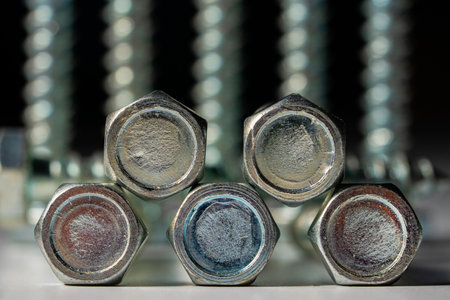 Metal screw bolts top view as industrial equipment background.