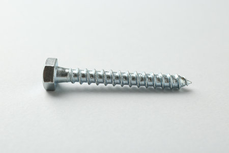 One metal bolt on light grey background. Hardware tool