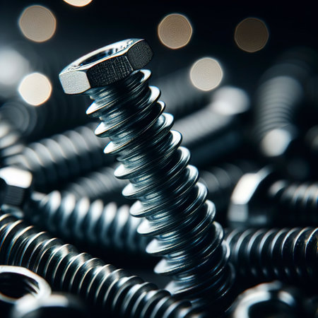 A close-up of a reflective metal bolt reveals intricate threading and a textured head, set against a blurred backdrop emphasizing craftsmanship and industrial detail
