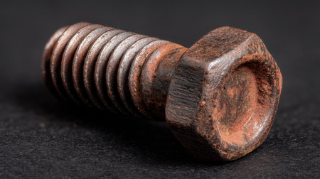 A striking close-up image of a rusty steel screw resting on a textured dark surface, showcasing intricate details and reflections in a dramatic light.