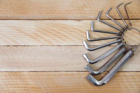 Set of hex keys on a ring on the wooden background with a copy space