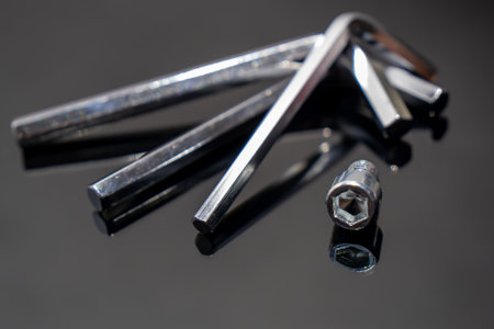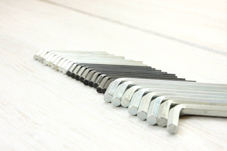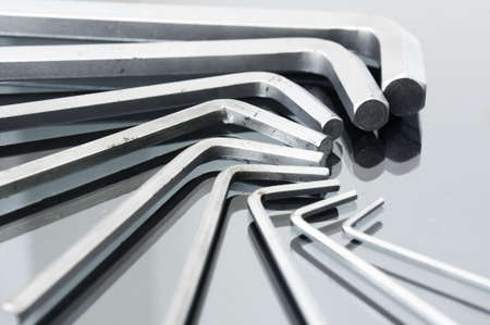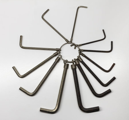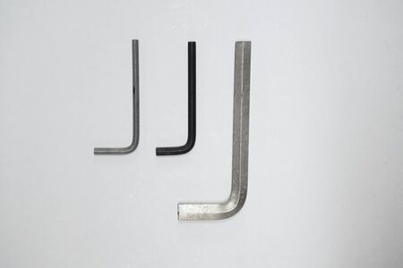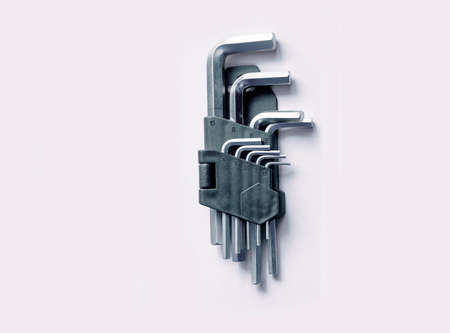 hex key wrench set on white grey background, steel carbon hand tool, repair