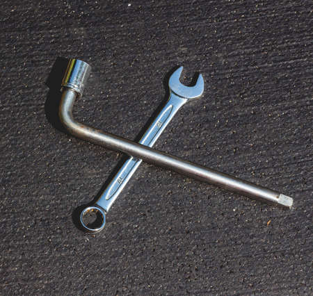 a spanner on old abandoned iron plate. - industrial workshop hand tools concept.