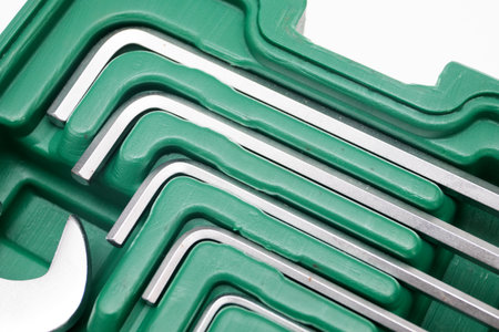 A selective focus shot of a new set of hex keys in a toolbox