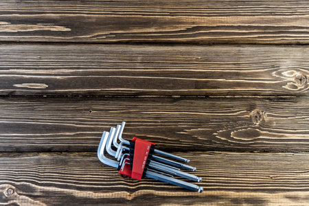 Allen keys set lie on wooden background. Place for text on the left.