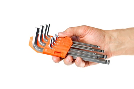 Hand holds the hex keys to repair the car. Close up. Isolated on white background.
