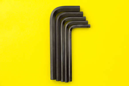Black metal hex keys on yellow background. Allen wrench tool. Set of hexagon keys.