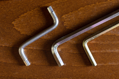 A set of three allen key-hex wrench on brown wooden background.