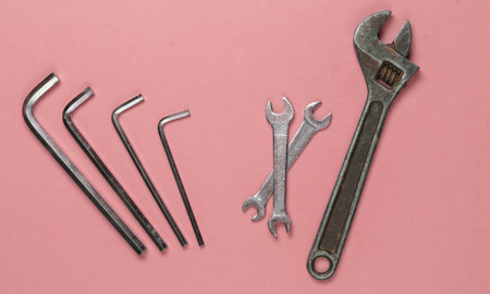 Set of wrench on pink background. Work tool. Top view